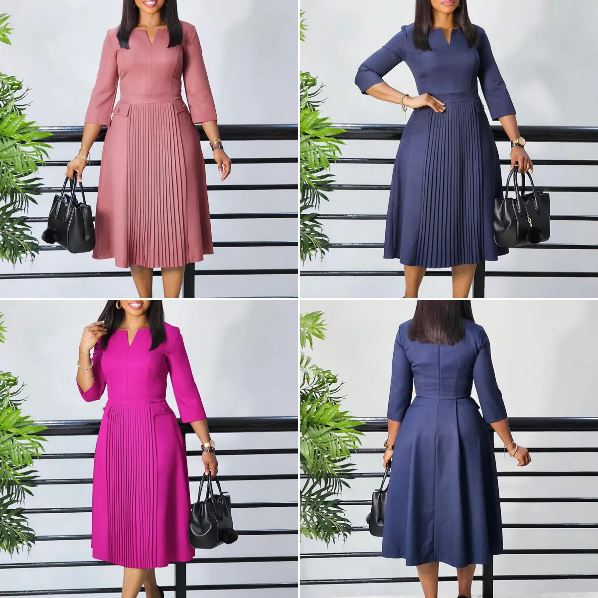 D529 Latest Design Autumn Ladies Office Dresses Women Casual Elegant Solid Color Pleated African Dresses for Women Clothing